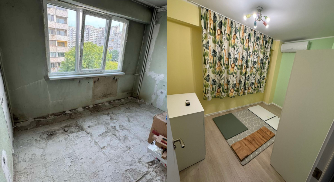 Кухнята бе преобразена в уютна детска стая, боядисана с топли цветове латекс. Прокарани бяха нови тръби за вода и канал към хола, което позволи създаването на просторна и функционална зона, обединяваща хол и кухня.