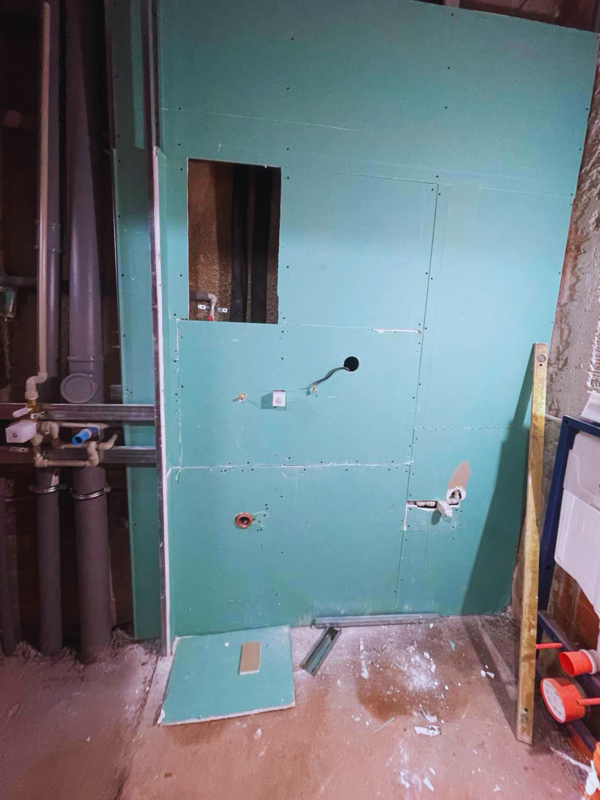 В следващата фаза се фокусирахме върху монтирането на окачени тавани и предстенни обшивки от гипсокартон, заедно с монтирането на каменна вата, която осигури отлична топло- и шумоизолация на помещенията. В баните инсталирахме съвременни вградени структури за санитарни уреди, включително хигиенни душове и смесители за вграждане, за да осигурим максимална функционалност и естетика.